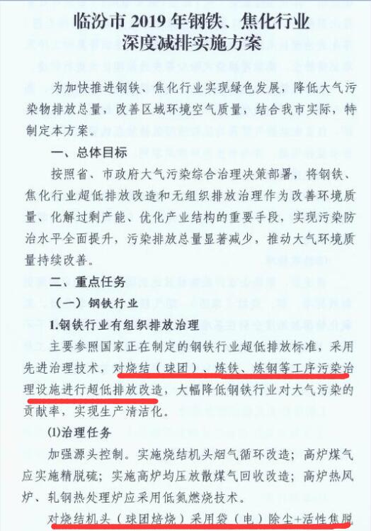 日前,山西臨汾印發《臨汾市2019年鋼鐵、焦化行業深度減排實施方案》。方案要求: