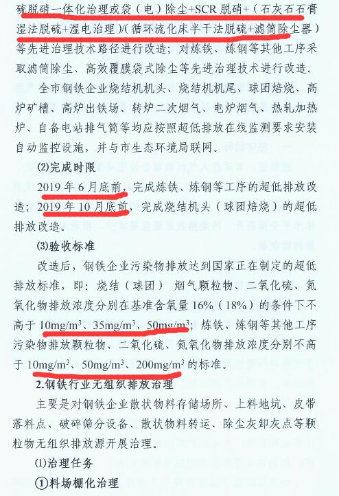 1、2019年6月底前,完成煉鐵、煉鋼等工序的超低排放改造;2019年10月底前,完成燒結機頭(球團焙燒)的超低排放改造。