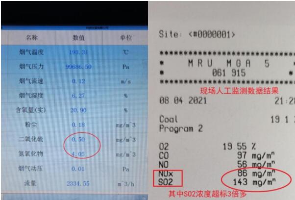 企業煙氣在線監測系統的日常運維交給第三方山西世紀天源環保技術有限公司負責。督察發現,運維公司通過在線監測數據造假等方式,掩蓋恒達公司偷排和嚴重超標排放的違法事實。煙道煙溫是判斷旁路煙氣是否偷排的重要指標,但運維公司人員在日常運維中一直上報煙溫監測設備存在故障,認為數據失真,而對煙氣二氧化硫、氮氧化物濃度長期低于10毫克/立方米的異常情況熟視無睹,裝聾作啞。經現場人工監測,煙氣實際二氧化硫和氮氧化物排放濃度分別為143毫克/立方米和86毫克/立方米,其中二氧化硫濃度超過《煉焦化學工業污染物排放標準》3.8倍,與此同時在線監測數據卻顯示二氧化硫、氮氧化物濃度分別為0.50毫克/立方米和4.05毫克/立方米,數據嚴重失真,存在造假行為?!鲌D7 在線監測數據(左圖)顯示二氧化硫和氮氧化物濃度分別為0.50毫克/立方米和4.05毫克/立方米;而現場人工監測數據(右圖)顯示二氧化硫和氮氧化物實際濃度分別為143毫克/立方米和86毫克/立方米。在線監測數據嚴重失真,存在造假行為。